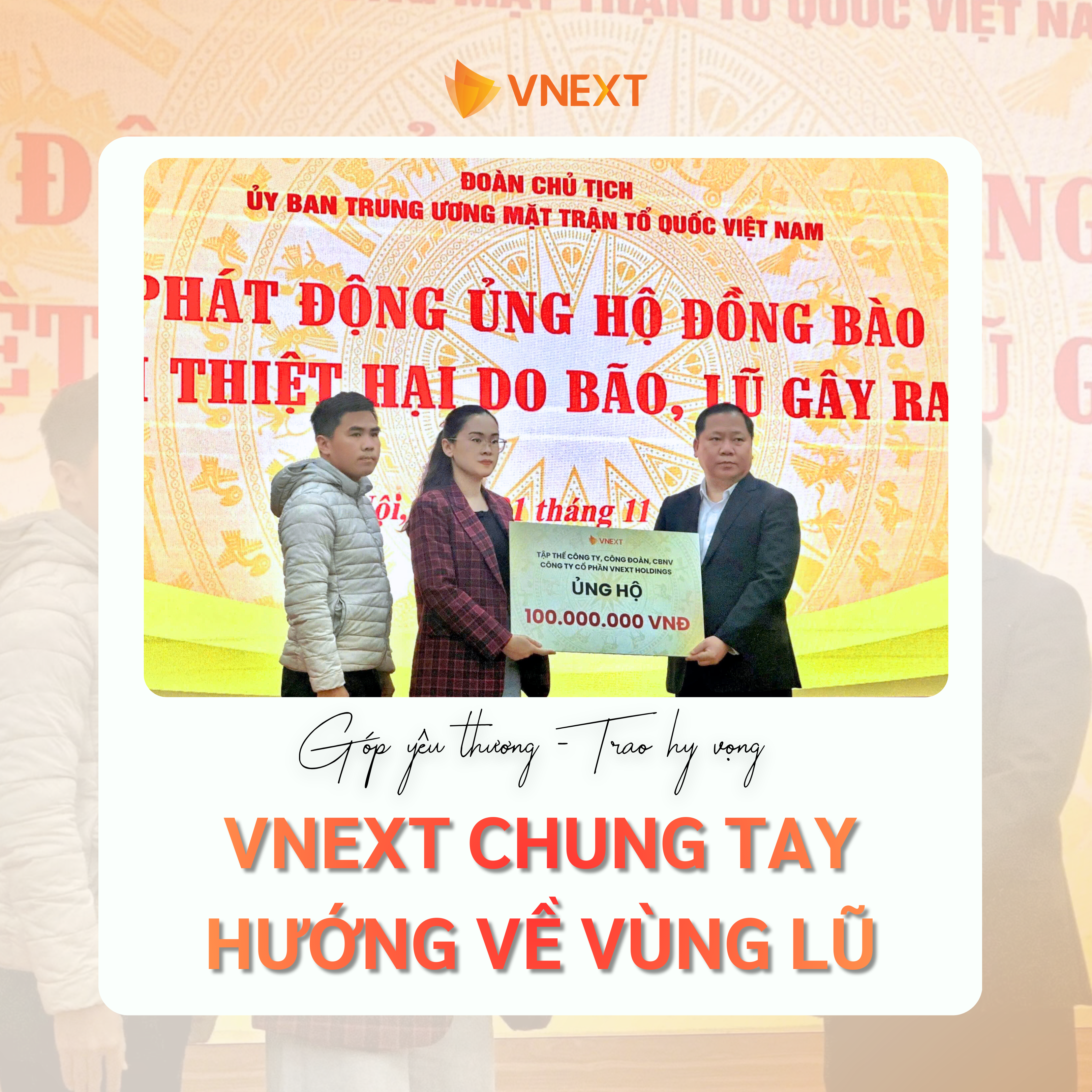 Nhờ sự hưởng ứng nhiệt tình của toàn thể CBCNV, chương trình đã nhận được 100.000.000 VNĐ ủng hộ. Toàn bộ số tiền đã được gửi tới Ủy ban MTTQ Việt Nam, như một lời động viên và hy vọng tới bà con vùng bão lũ. Ngay trong chiều 21/11/2025, VNEXT vô cùng vinh dự khi được tham dự Lễ phát động ủng hộ đồng bào bị thiệt hại do bão, lũ gây ra do Ủy ban Trung ương Mặt trận Tổ quốc Việt Nam tổ chức và trực tiếp trao tặng số tiền ủng hộ.