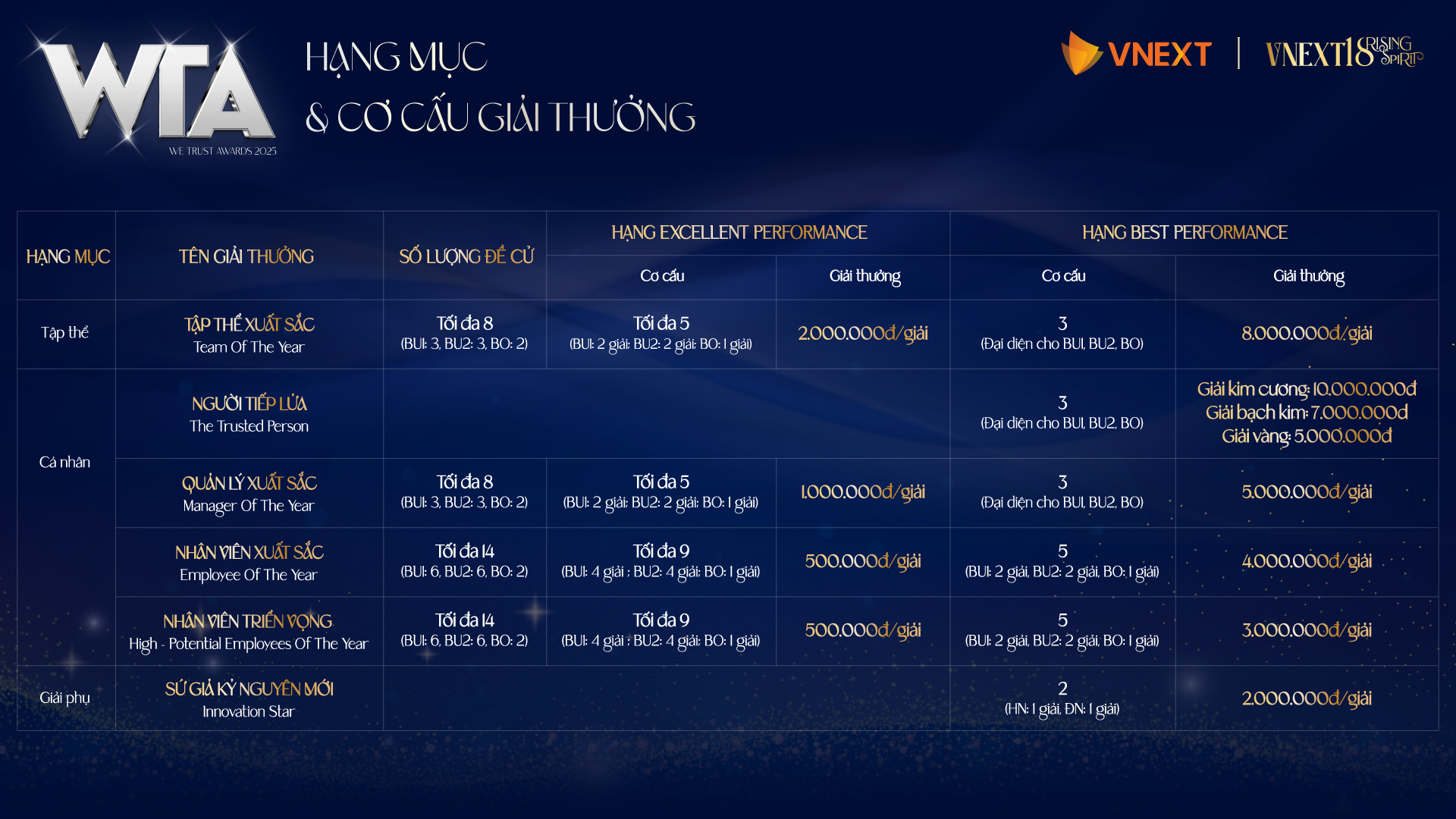 Bước sang mùa giải thứ 5, WE TRUST AWARD 2025 trở lại với diện mạo mới, đánh dấu bước chuyển mình quan trọng thông qua sự thay đổi trong phần Hạng mục và cơ cấu giải thưởng. Theo cơ cấu mới, mỗi tập thể/cá nhân khi có tên trong danh sách đề cử, BGK sẽ tiến hành chấm chọn theo tiêu chí đã ban hành và chia thành 2 hạng giải thưởng: Excellent Performance và Best Performance. Cụ thể, WE TRUST AWARD 2025 bao gồm các hạng mục - cơ cấu giải thưởng và timeline như sau: