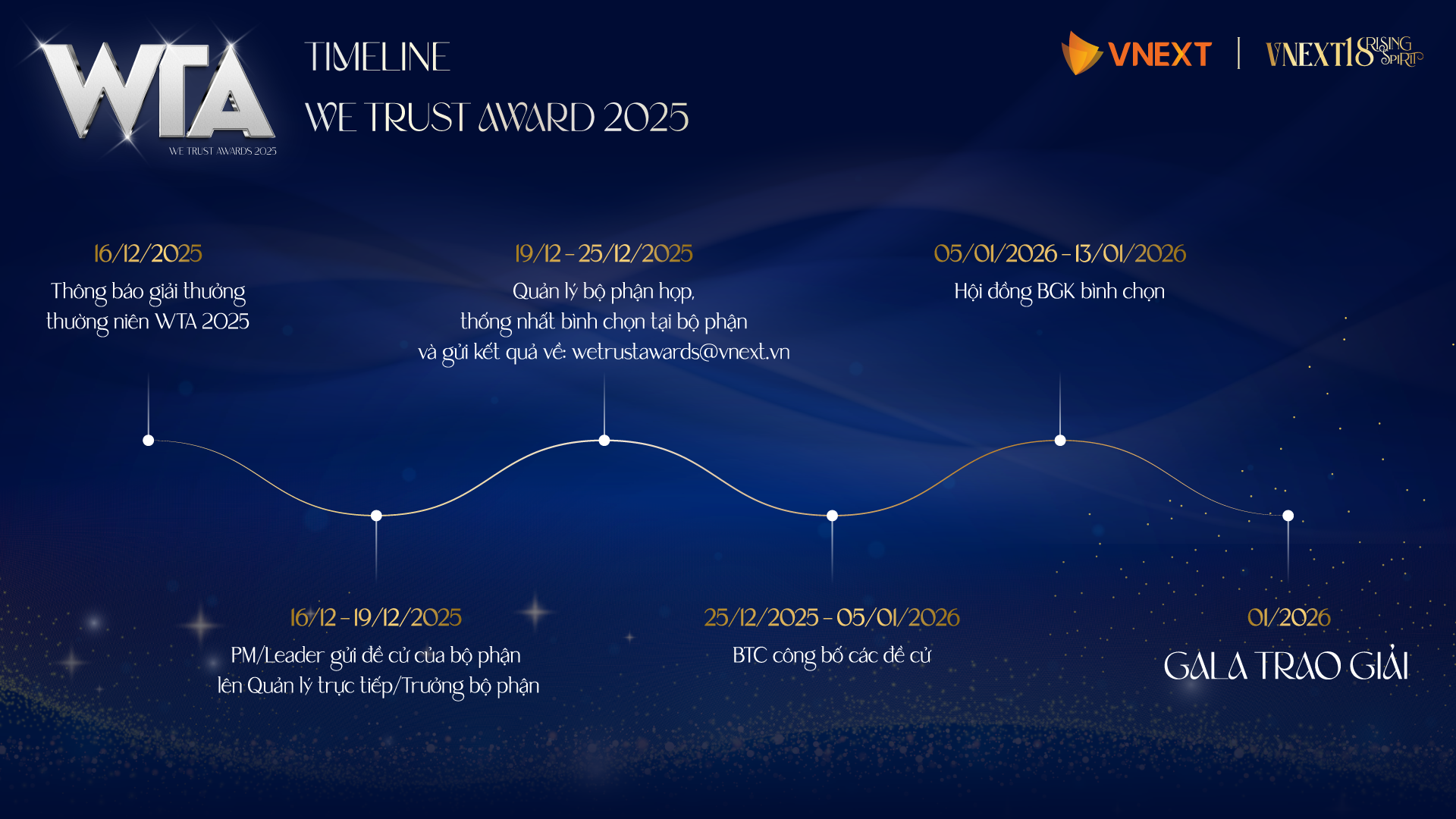 Trên hành trình phát triển của Công ty, mỗi bước tiến vững chắc đều được tạo nên từ những nỗ lực, sự cống hiến không ngừng nghỉ của tập thể anh chị em VNEXTers. Chính tinh thần trách nhiệm, sự tận tâm ấy đã góp phần tạo nên VNEXT ngày một lớn mạnh! Và để tri ân những đóng góp đó, WE TRUST AWARD 2025 - mùa giải mà chúng ta mong đợi nhất trong năm đã chính thức quay trở lại! Với sứ mệnh không chỉ vinh danh những thành tích xuất sắc của các tập thể/cá nhân cho sự phát triển chung của Công ty, đây còn là biểu tượng của niềm tin, sự trân trọng và cam kết của Công ty trong việc đề cao các giá trị tích cực.